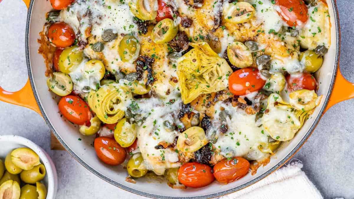 Level up your Italian-themed dinner by making baked Italian chicken. Pan-seared seasoned chicken topped with cherry tomatoes, olives, and cheese is an Italian dish with fewer carbs yet very indulgent and luxurious!