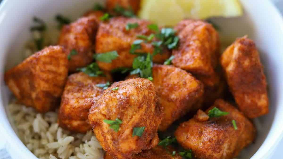 After a long day, these salmon bites are just the perfect quick dinner. Covered in Cajun rub, and quickly cooked in an air fryer, they turn out moist, a bit spicy, and pair well with aioli and rice.