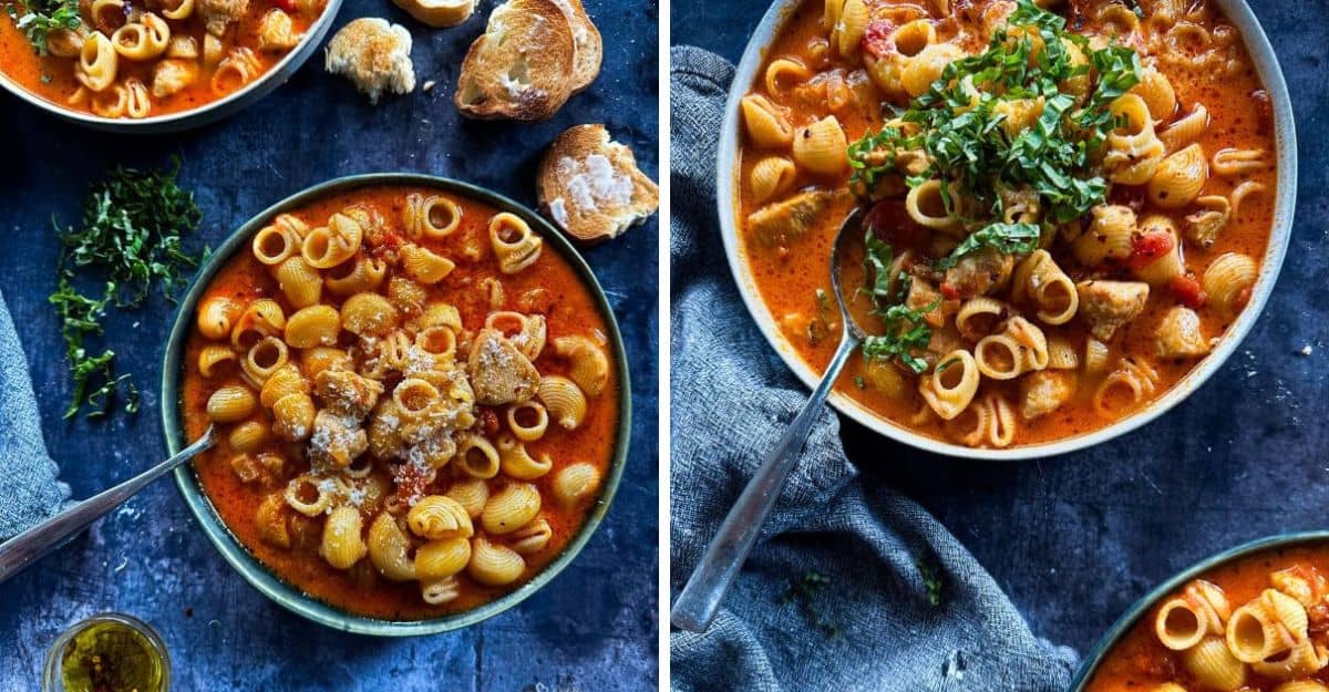This thick and heavy chicken soup is perfect for those cold lazy nights. The tender chicken is thickened with diced tomatoes, cream, and pasta to make a delicious and flavorful soup.