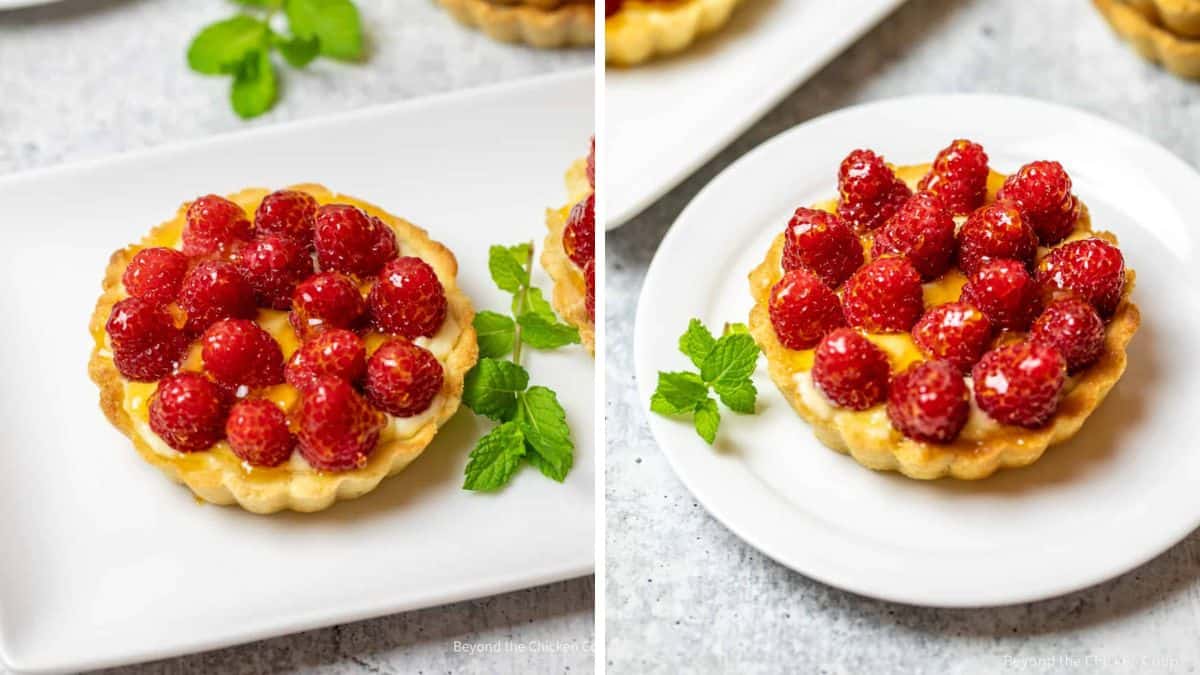 These Mini Raspberry Tarts are made with a homemade crust and a pastry cream filling. Then they are topped with fresh raspberries. Super simple ingredients and easy to make, you have to try this.