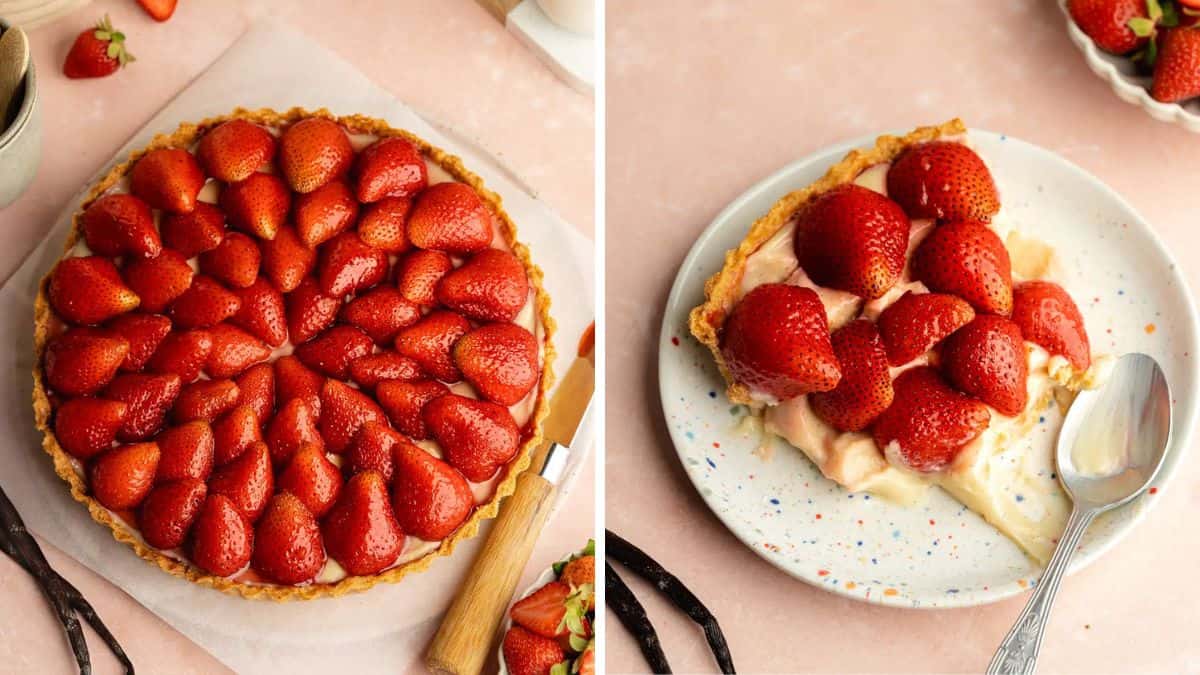 This Tarte Aux Fraises is a tasty French Strawberry tart. An eggless and dairy-free take on a classic, making it vegan-friendly. Buttery pastry filled with vanilla pastry cream and topped with juicy macerated strawberries.
