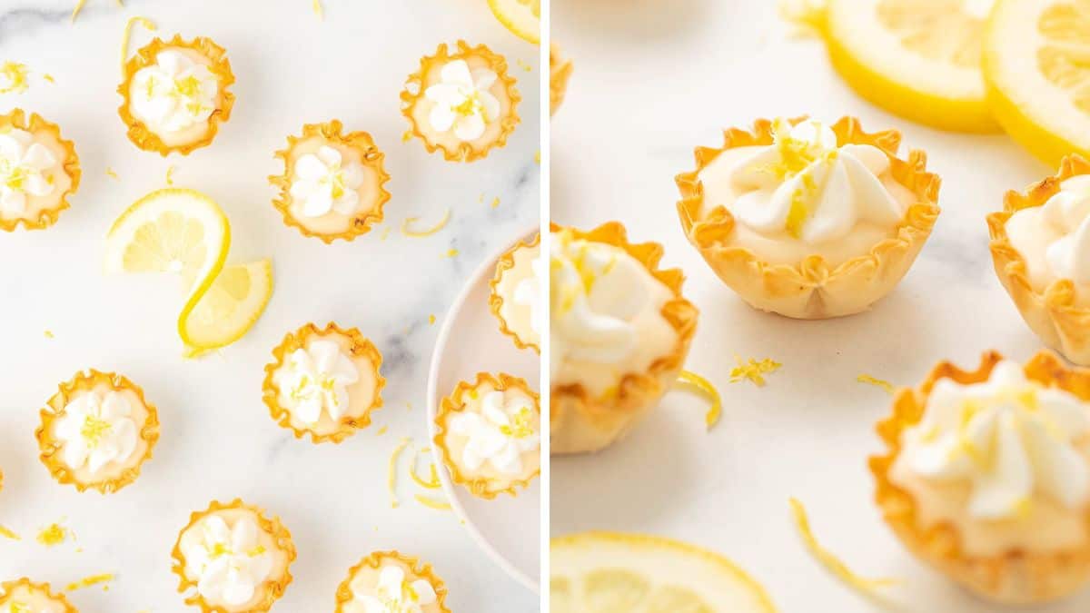 These Mini Lemon Tarts with Phyllo Cups are delicate treats made with crispy phyllo shells filled with tangy lemon curd and homemade whipped cream, making for the perfect bite-sized dessert.