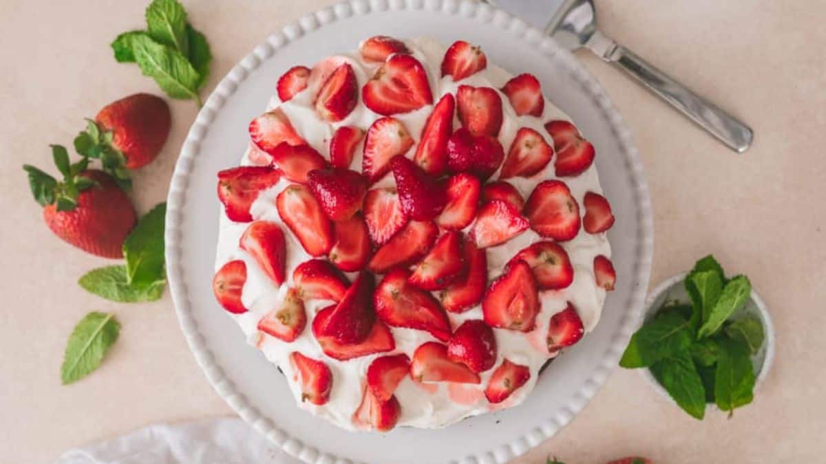 This Strawberries and Cream Chocolate Cake has a single layer moist chocolate cake with a hint of espresso, topped with whipped cream, and macerated strawberries. This chocolate cake recipe is sure to be your new favorite dessert!