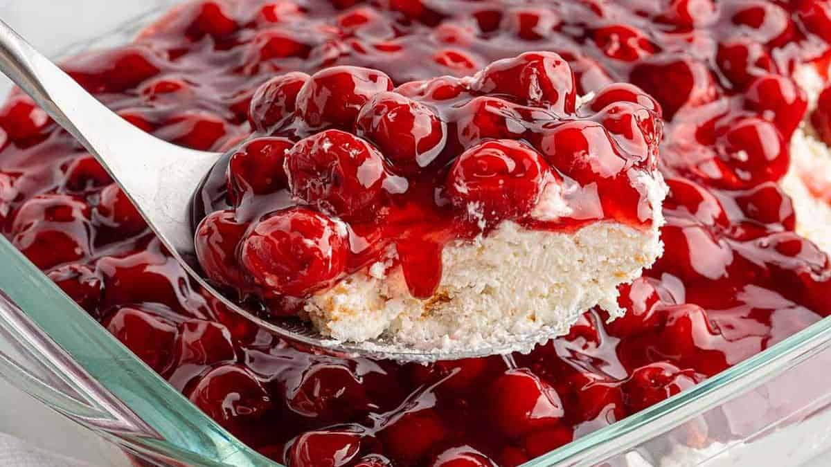 This Cherries in the Snow recipe is a no-bake dessert with angel food cake, cream cheese, and cherry pie filling. So quick and easy to make bursting with fruity flavors and balanced with the creamy texture. You have to try this!