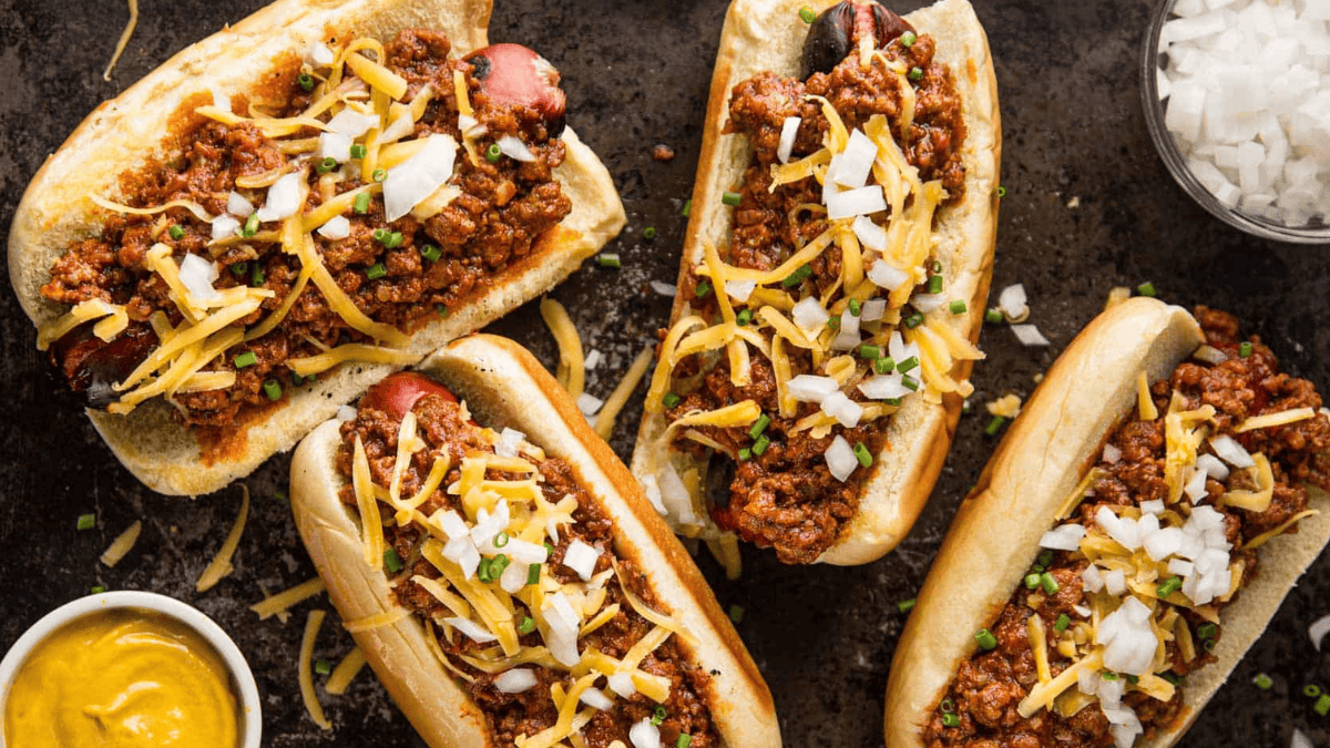 Get the recipe: Chili Dog – With Sweet Onions and Mustard