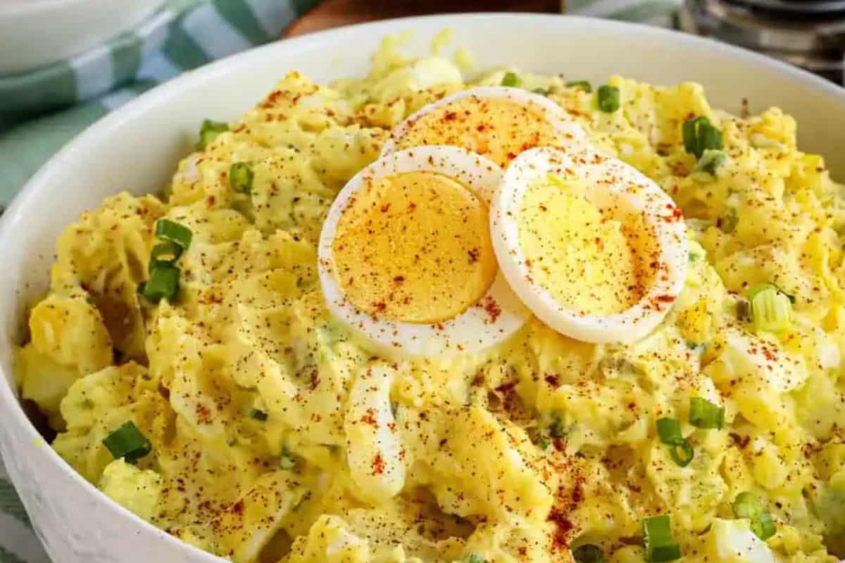 Southern potato salad is a potluck staple. It is loaded with hard boiled eggs, crunchy celery and a mayo-based dressing. This side dish goes with ham, fried chicken, burgers and more!