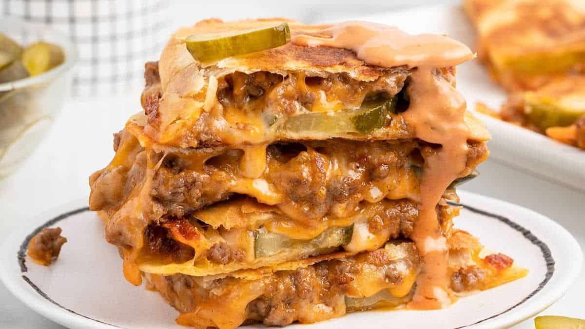 This creative 30-minute meal combines the savory flavor of cheeseburgers with a crunchy quesadilla. This has all the toppings and even a drizzle of special sauce.