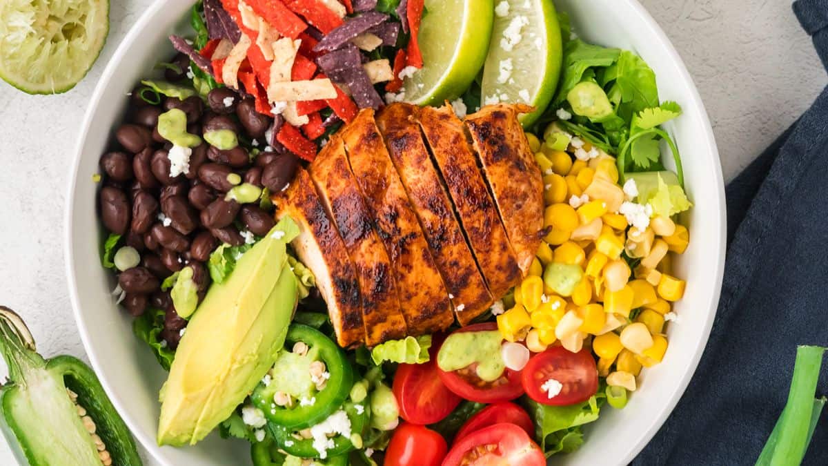 This flavorful salad is the perfect quick and easy dinner recipe or can be made for meal prep for the week. The chicken is perfectly seasoned in a spice rub and cooked in a skillet until perfectly tender.