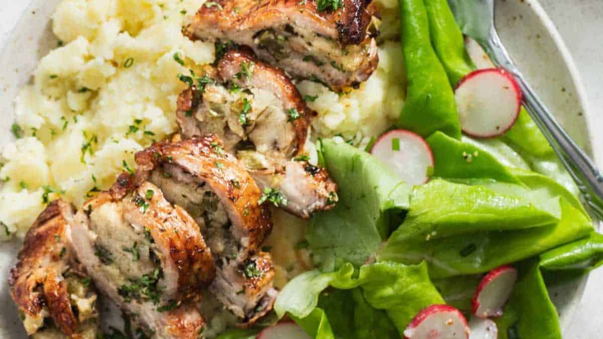 These pork chops are stuffed with a delicious herb bread stuffing and cooked in the air fryer for a quick dinner. These come together in about 30 minutes.