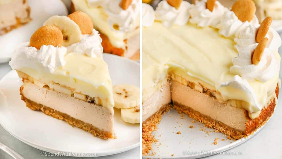 Layers of tangy cheesecake, banana slices, and cookies are topped with banana pudding over a vanilla wafer crust. It’s topped with whipped cream, more bananas, and cookies, what’s not to love?