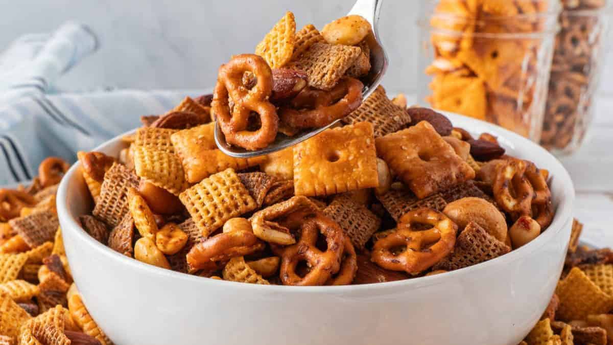 Elevate your snacks game with bold flavors of this Firecracker Chex Mix with crunchy pretzels, crackers, and corn Chex spiced with ranch-based sauce with red pepper flakes and chipotle.