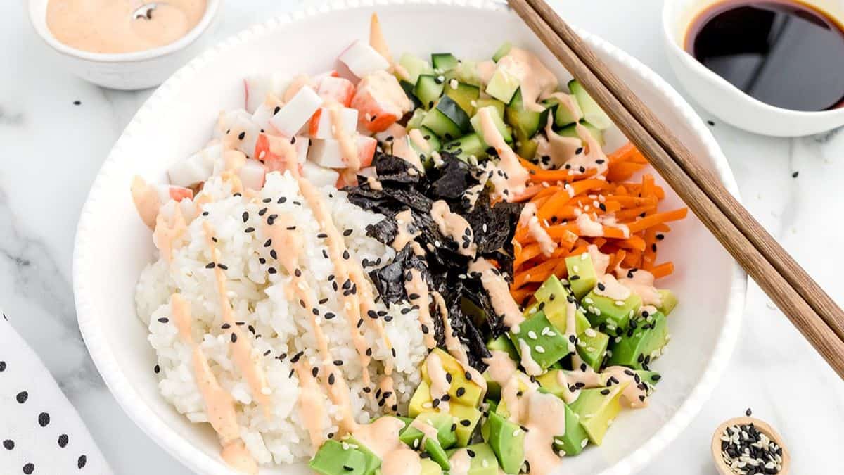 This California roll sushi bowl has the great flavor of your favorite roll in a deconstructed bowl that is easier to make. Loaded with crab, avocado and vegetables this makes a light and delicious lunch or dinner.
