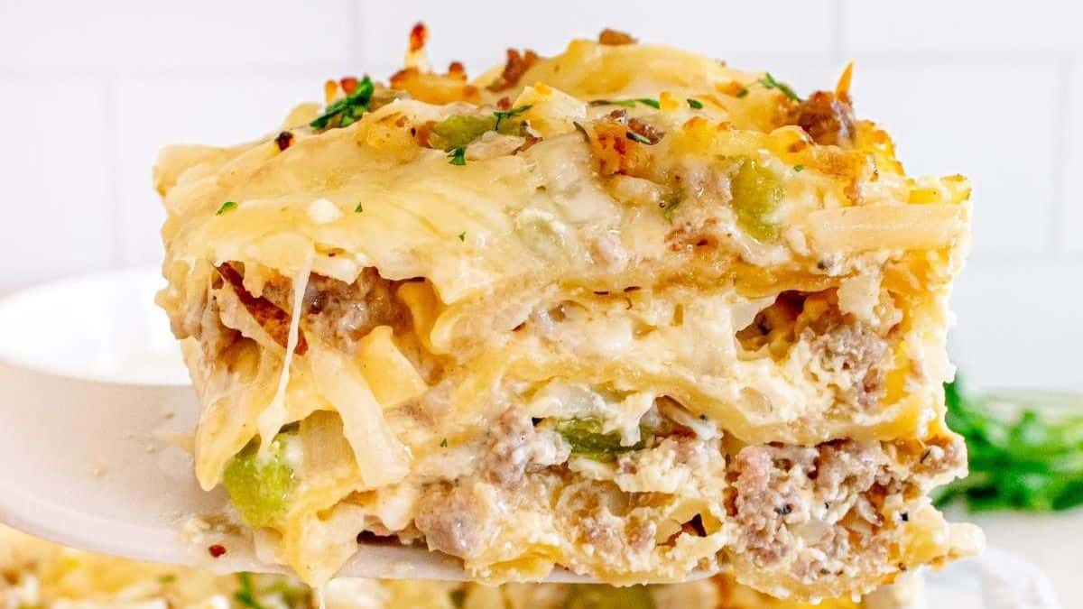 This hearty breakfast lasagna is a casserole loaded with all of your favorite savory breakfast favorites like cheese, sausage and eggs but layered in a lasagna style casserole. This is a great breakfast or brunch to serve for a holiday morning and will feed a crowd.