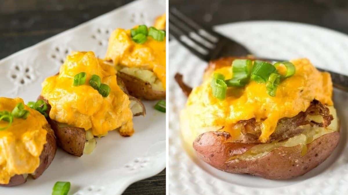 This is a one-item, fulfilling, and delicious meal your whole family will love. Shredded buffalo chicken is stuffed into every potato before drizzling buffalo sauce over this meal. Cheese and green onions are added as toppings.
