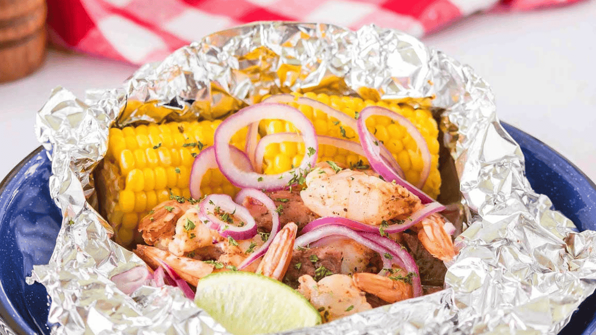 Steak and shrimp pair up with corn and red onion in these delicious surf n turf foil packets. It’s a great recipe to cook over a campfire, on the grill or even in the oven.
