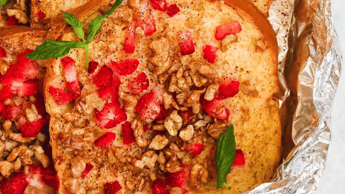 Super easy french toast foil packet with cinnamon, strawberry, and walnuts. This can be cooked in the oven, on a grill, or over the campfire! It’s a great camping and grilling recipe that can be enjoyed for breakfast or dessert.