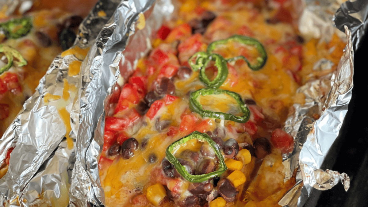 These nachos are so easy to put together. You can use an disposable aluminum pan or cast iron skillet to cook these over the campfire or grill. They are perfectly cheesy and delicious.