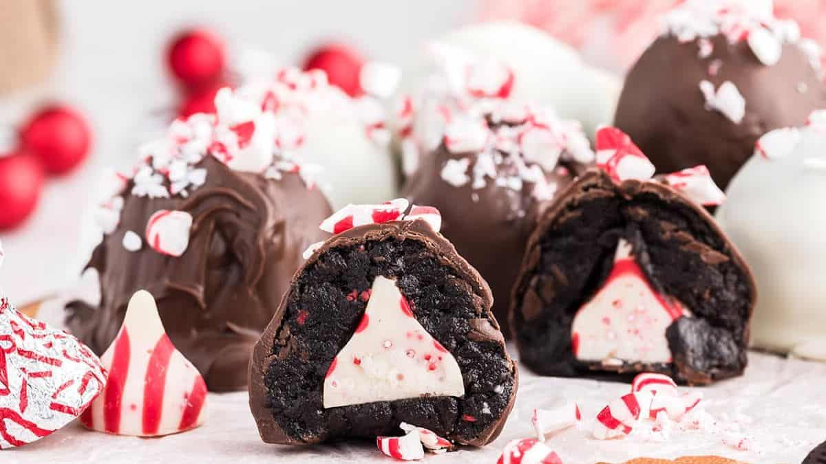 These adorable Oreo balls may not look like much, but you will be surprised to find a combo of cheesecake, candy cane, truffle, Oreos, and a whole chocolate Hershey kiss candy inside each of these balls!