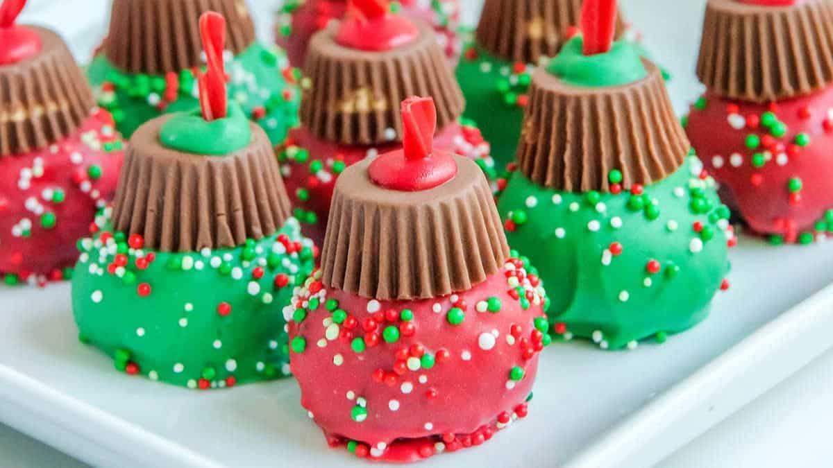 Don't mix up these ornaments with ones on the Christmas tree! Red and green, with holiday sprinkles and tiny licorice on top. And inside - soft and indulgent truffles.