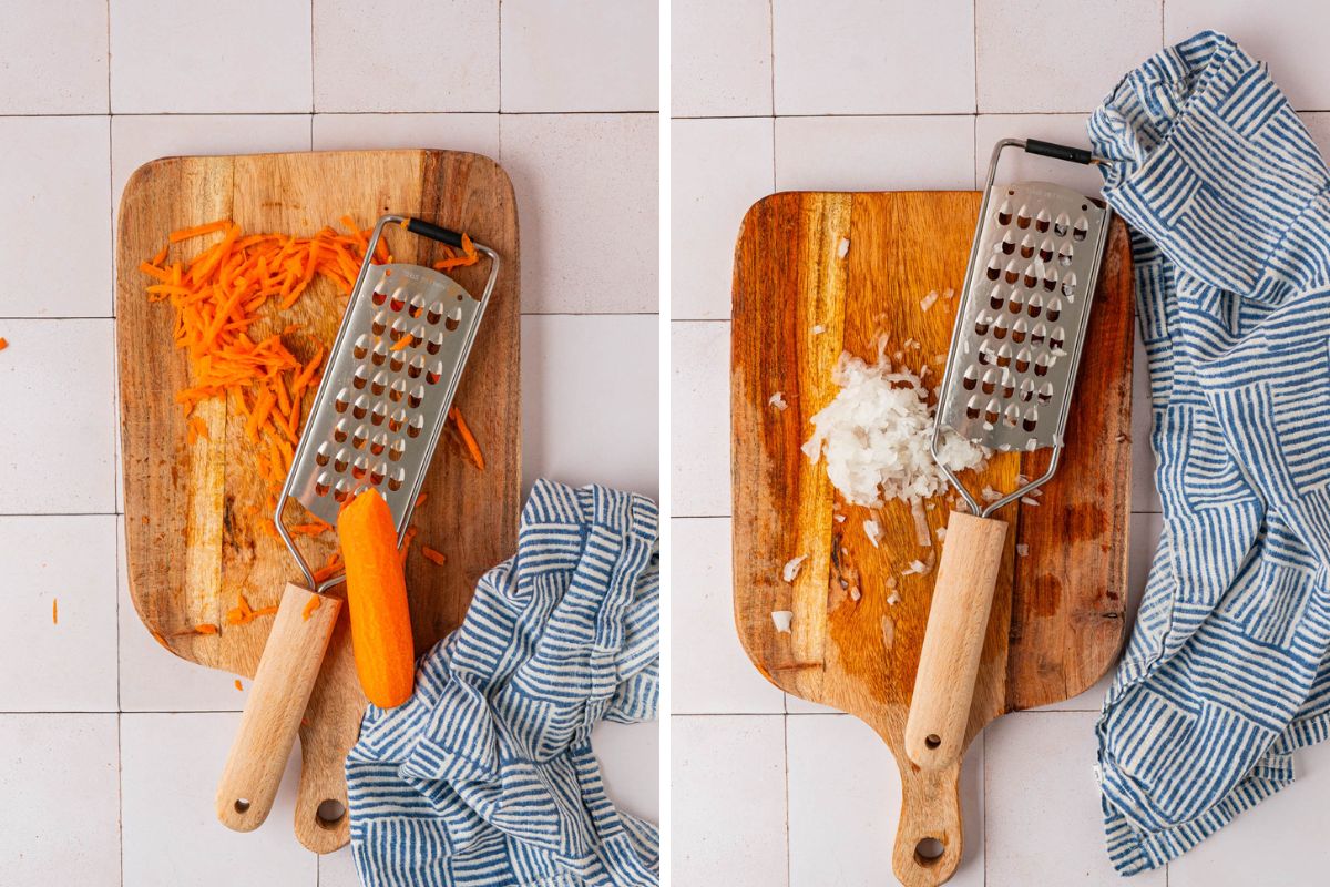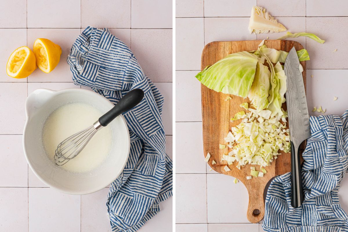 - Finely shred the cabbage and add to a large mixing bowl. Peel and grate the carrot and white onion and add to the bowl.