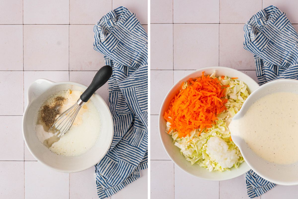 Make the dressing by whisking the mayonnaise, sugar, salt, and pepper into the prepared buttermilk until completely smooth and well combined. Taste the dressing before adding it to the slaw to make sure it has the perfect balance of creamy, tangy, and sweet.