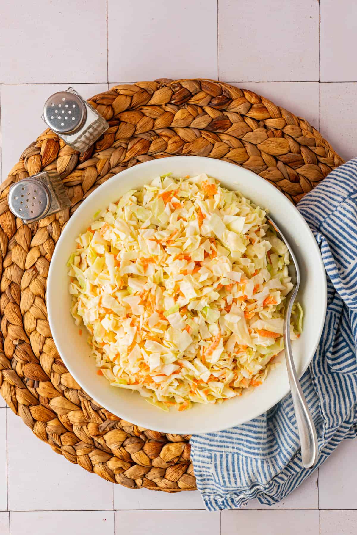 - Finely shred the cabbage. The key to this copycat KFC coleslaw tasting authentic is a fine shred. Coarse chunks won't absorb the dressing the same way.