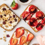 There are so many amazing topping ideas outside of the 3 variations I have listed in this recipe. Add cottage cheese to avocado toast for a great source of protein. Any fresh fruit will taste amazing with creamy cottage cheese. Add slices of cucumbers with fresh dill and a drizzle of olive oil for a savory cottage cheese toast. Take a look in your pantry and refrigerator and find inspiration for cottage cheese toast recipes!