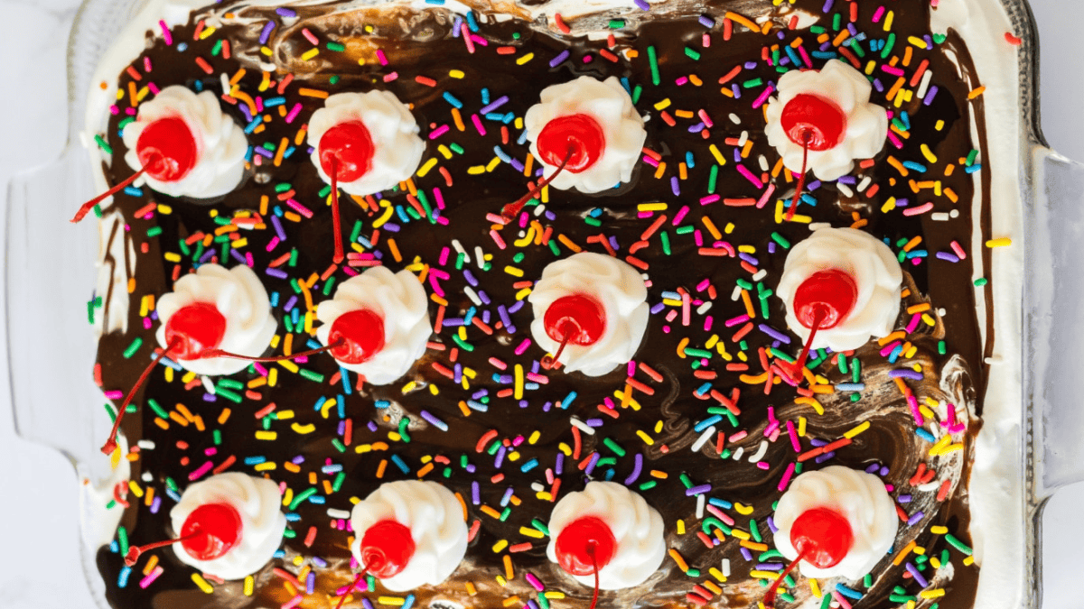 This No Bake Banana Split Lush is layers of a graham cracker crust, sweet cream cheese filling, and delicious pudding. Then topped off with cherries and hot fudge to take it over the top.