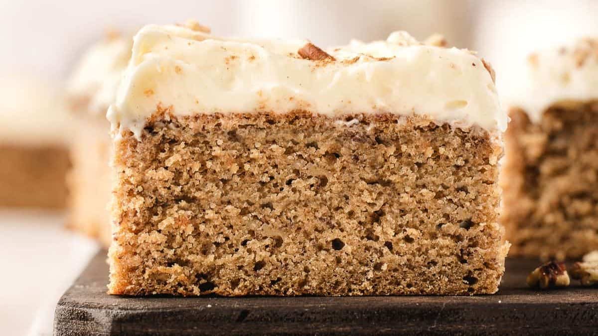 This light banana cake has a creamy frosting made from cream cheese and powdered sugar. Sprinkle with chopped nuts for a little extra crunch.