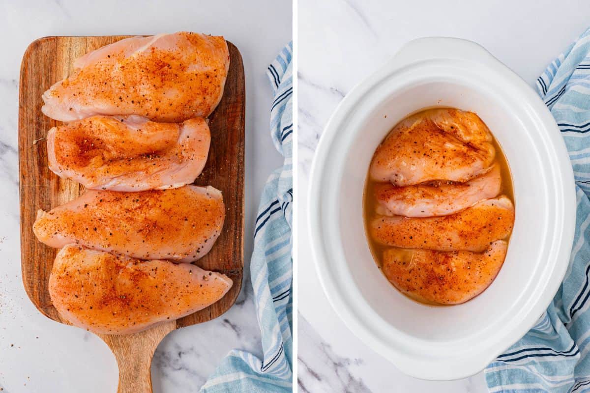 - Pour chicken broth into the bottom of slow cooker.