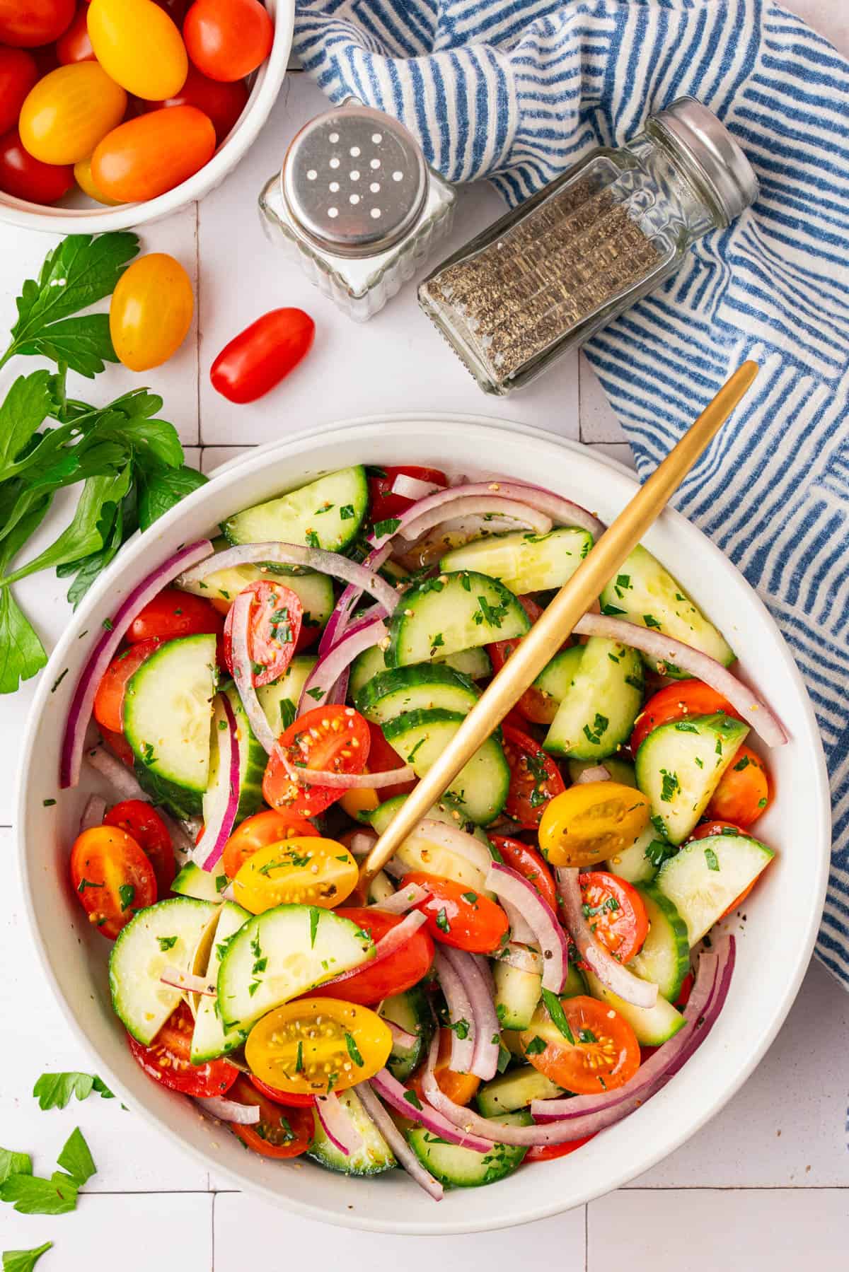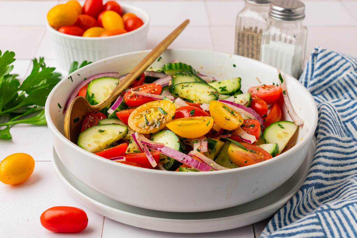 This salad is a great make-ahead idea. You can prep the vegetables and whisk together the dressing up to a day in advance, storing them separately in airtight containers in the refrigerator. When you're ready to serve, pour the dressing over the vegetables and toss to combine. If you mix the salad ahead of time, it will keep well for up to 24 hours. The cucumbers will soften a bit as they sit, which some people prefer.