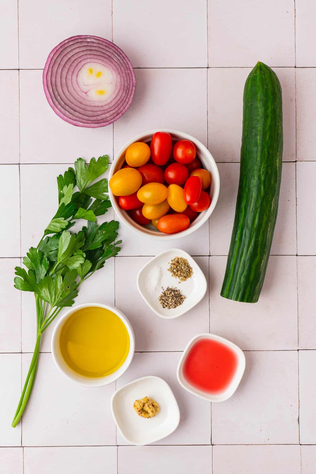 Start by preparing your vegetables. Slice the cherry tomatoes in half and add them to a large serving bowl. Slice half of the large English cucumber into rounds about a quarter inch thick for a satisfying crunch. Thinly slice a quarter of a small red onion and add that in as well. Finish with a tablespoon of freshly chopped parsley.