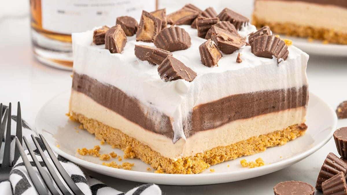 This grown up dessert has layers of creamy peanut butter and a whisky spiked chocolate filling. It is a dreamy no-bake dessert everyone will love!