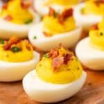 These deviled eggs bacon appetizers can easily be made ahead. Prepare the eggs and filling up to a day in advance, but store the filling separately. Pipe or spoon the mixture into the egg whites right before serving to keep everything fresh and creamy.