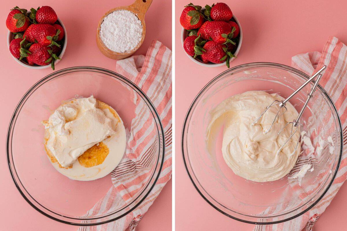 In a large mixing bowl, add the room temperature cream cheese, heavy cream, sour cream, lemon juice, and vanilla extract. Beat until smooth and creamy.