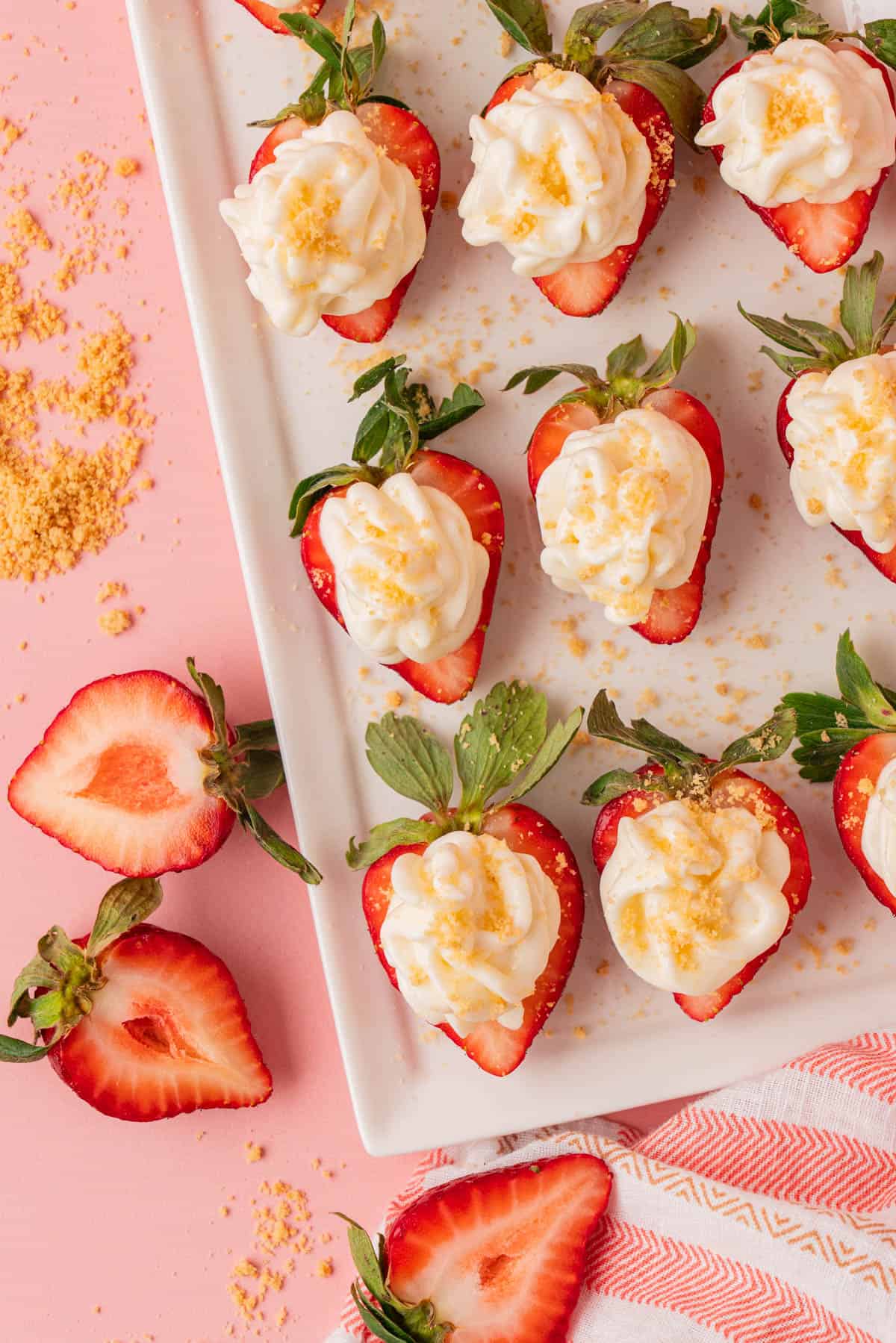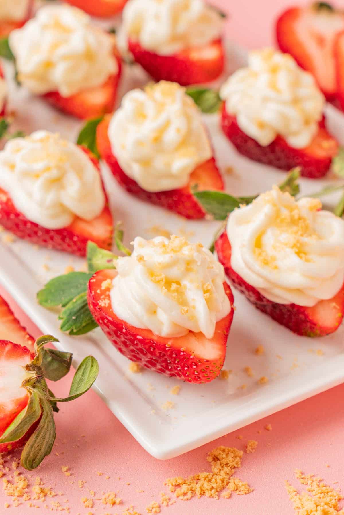 - Arrange the deviled strawberries on a plate or platter. Sprinkle with the crushed cookies and serve immediately.