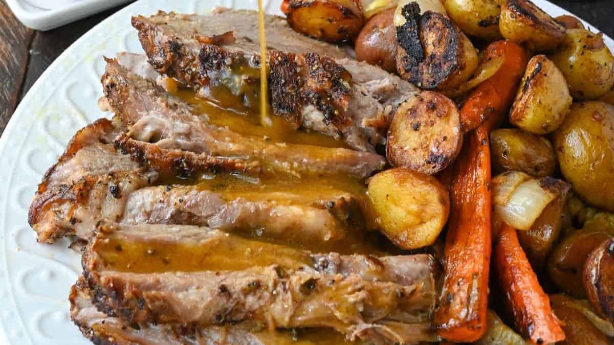 This roasted pork shoulder is cooked until completely tender with potatoes and sweet carrots. This is the perfect Sunday dinner for family gatherings.