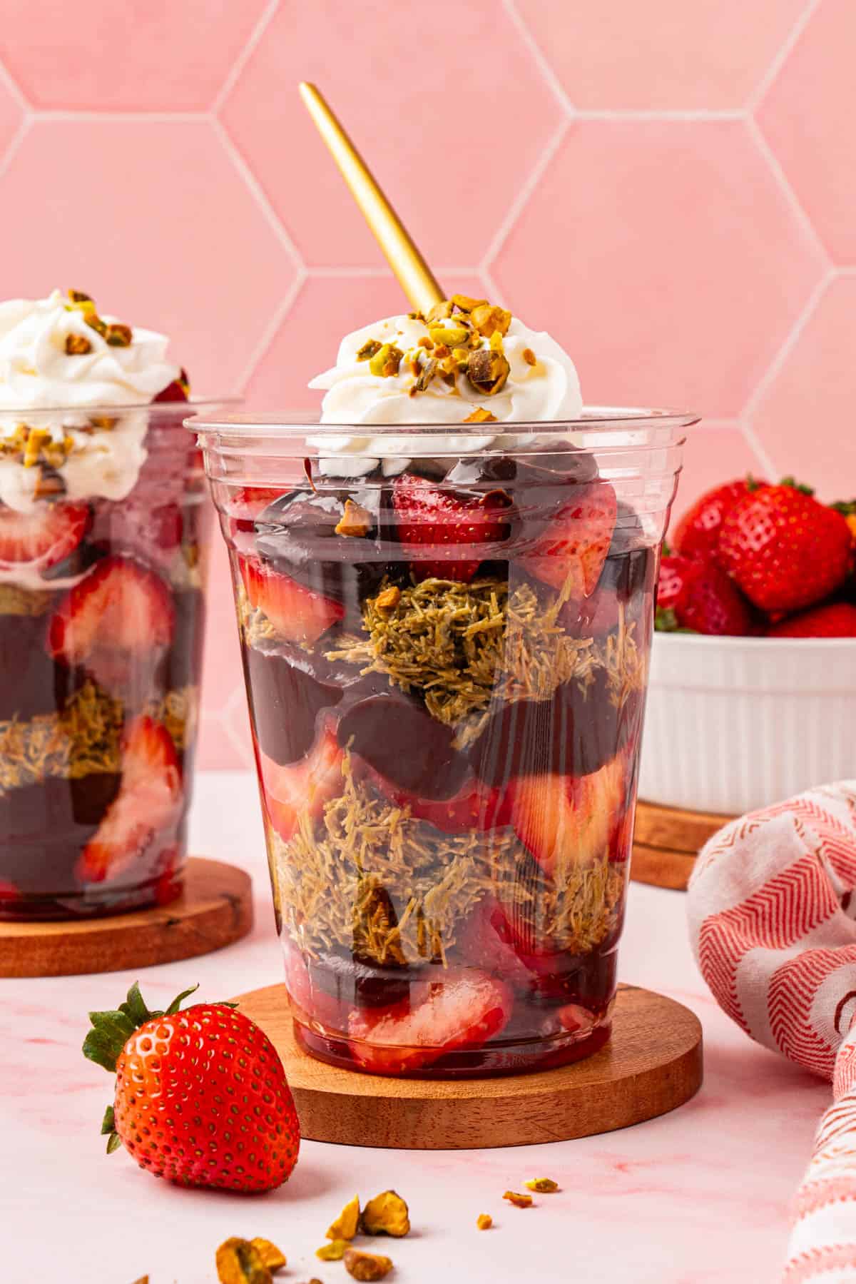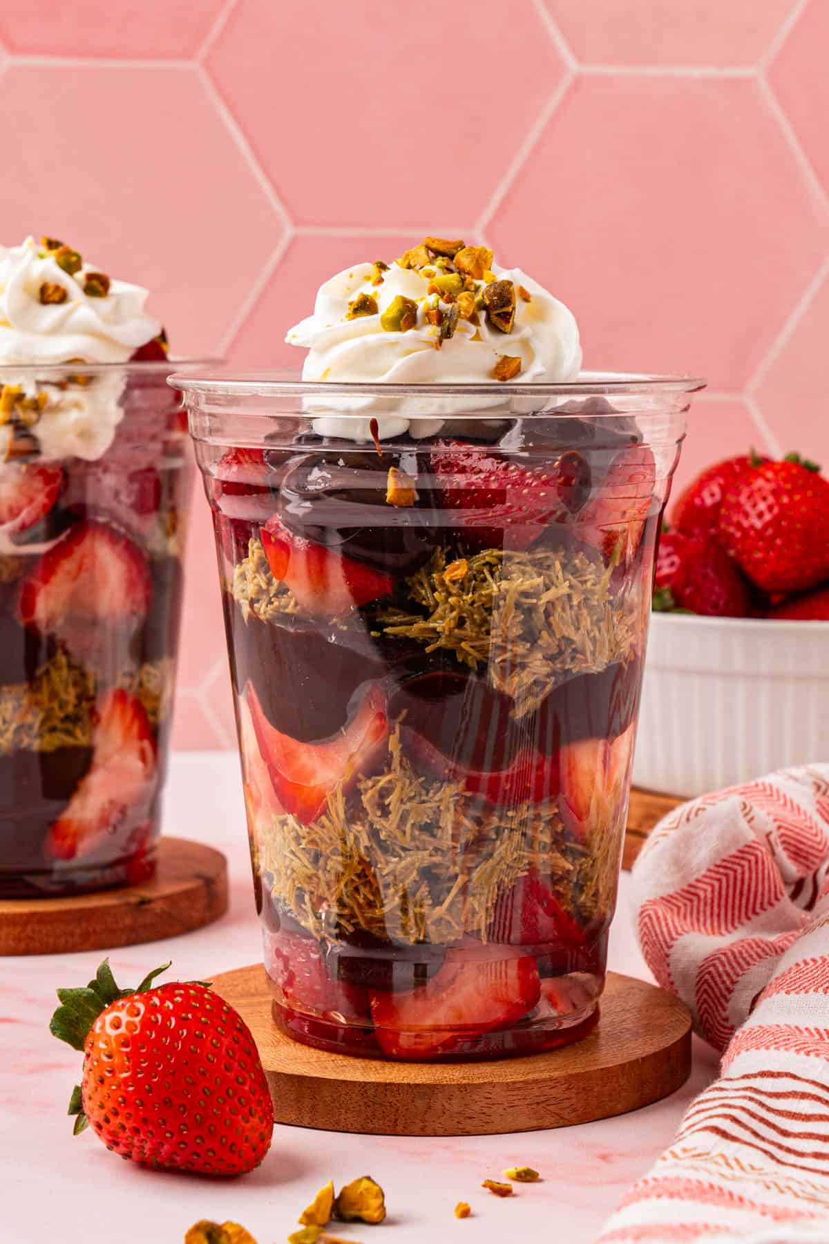 - Layer the Dubai cups by spooning strawberries on the bottom of the cup, followed by the chocolate ganache, and kataifi. Repeat layers to fill the cup.