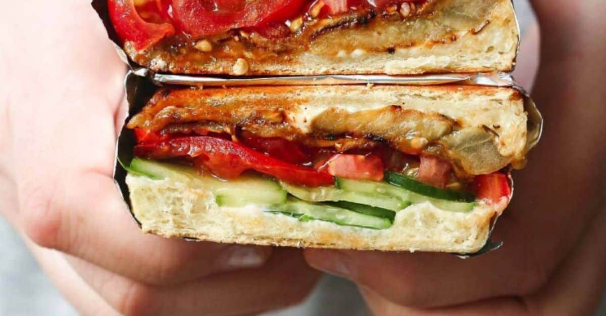 Smoked eggplants and fresh vegetables are packed in bread and then toasted to perfection to make this tasty sandwich. This easy-to-prepare meal is perfect for snacking, picnics, and when you need a quick bite.