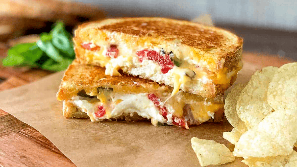 A grilled cheese sandwich with Southern staple - pimento cheese. The recipe pairs Pepper Jack cheese, cream cheese, cheddar cheese, mayo, and pimentos with hot sauce, and bacon. You won't go back to boring sandwiches again!