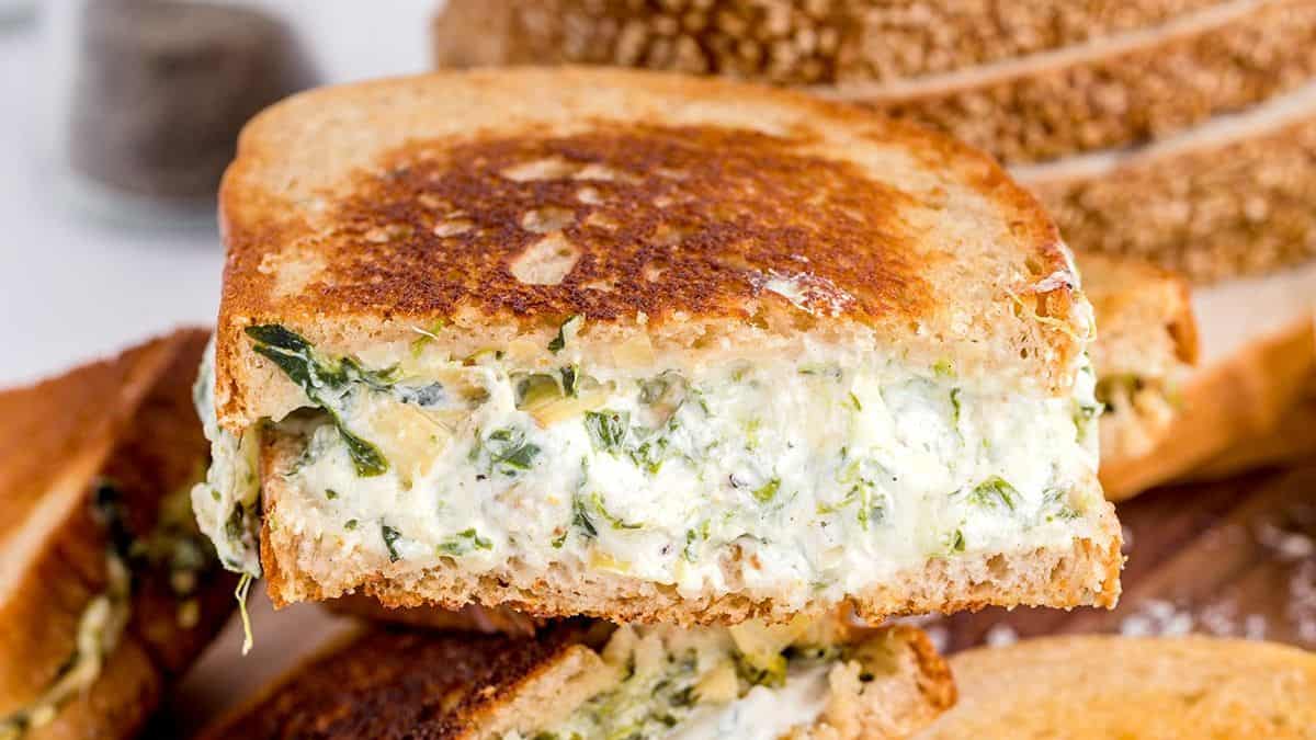 Transform your favorite appetizer into a delicious meal with this grilled cheese. Creamy spinach and artichoke dip is sandwiched between bread and grilled until ooey gooey perfection.