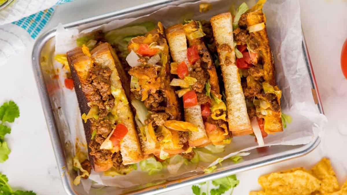 Do you love tacos and grilled cheese? This sandwich recipe is a perfect hearty combo of both. Mouth-watering taco meat, melty cheddar, veggies, and crispy bread.