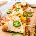 - Use a sharp knife to cut the quesadilla into thirds. Serve with avocado slices, tomatoes, salsa, jalapeño and sour cream.