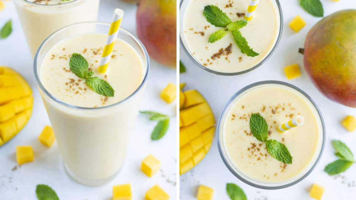 This mango lassi is a simple fruit smoothie made with fresh mango, yogurt and a pinch of spices. This popular Indian beverage is perfect for breakfast or lunch!