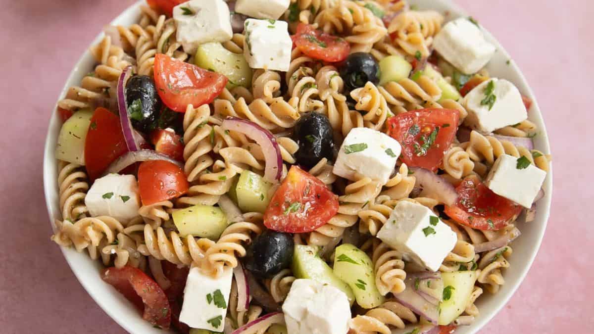 Healthy pasta recipes don't get easier than this! Just toss together wholegrain pasta, crunchy veggies, and tangy feta for a refreshing choice for light lunches, potlucks, or when you need a no-fuss side dish.