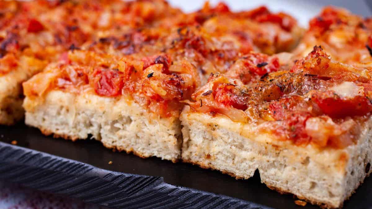 This is the perfect pizza to make. It has an almost focaccia-like thick pizza crust topped with an easy tomato sauce. Super tasty.