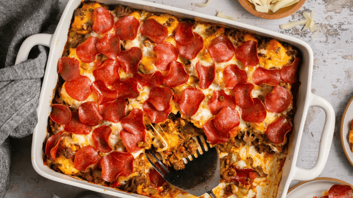 This easy weeknight casserole is made with only a handful of ingredients including ground beef, biscuit pieces, pizza sauce, and cheese. It tastes amazing!
