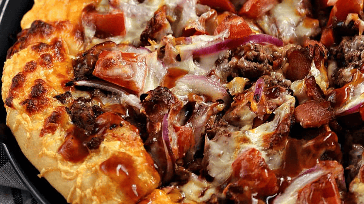 This Bacon Cheeseburger pizza has all of the flavor of your favorite burger in pizza form. Thin crust pizza topped with melted cheddar cheese, barbecue sauce, ground beef, thick-cut bacon, red onion, diced tomatoes, and melty mozzarella cheese.