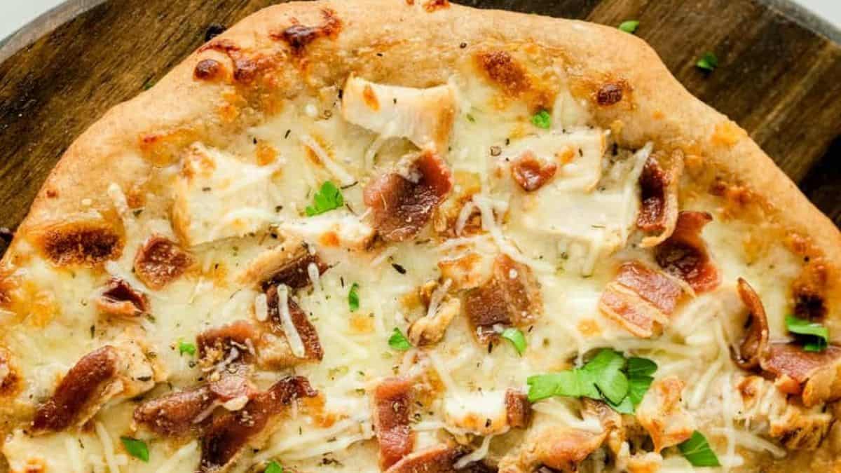 A healthier variation of a pizza and a more filling take on a classic Caesar salad. The Caesar dressing and moist chicken pair very well with the golden pizza crust. Some may argue that this pizza tastes better than the salad!
