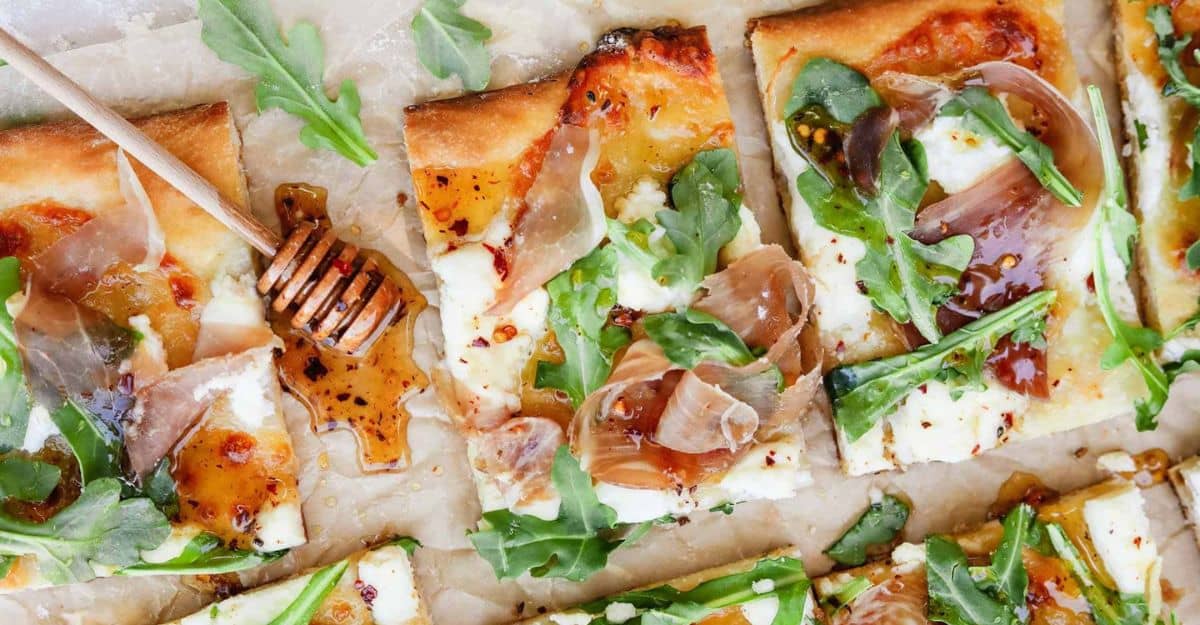 There is no sauce in this pizza, just cheese. This is a snack you can prepare in less than half an hour using simple ingredients. The hot honey glaze adds a delicious, sweet, and spicy flavor to the pizza.